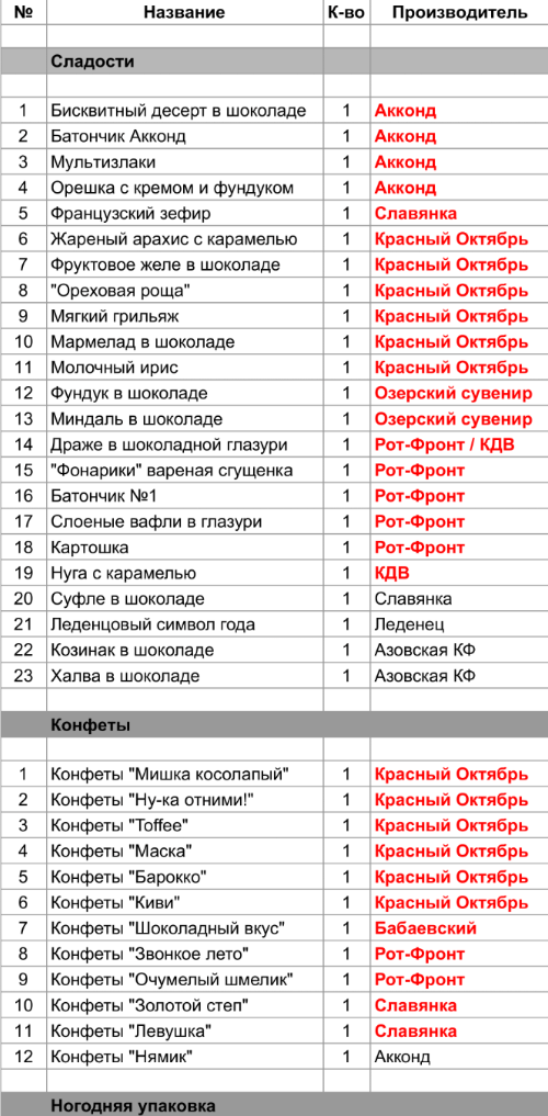 Драже в шоколадной глазури (1 шт), "Фонарики" вареная сгущенка (1 шт), Батончик №1 (1 шт), Слоеные вафли в глазури (1 шт), Картошка (1 шт), Конфеты "Звонкое лето" (1 шт), Конфеты "Очумелый шмелик" (1 шт)