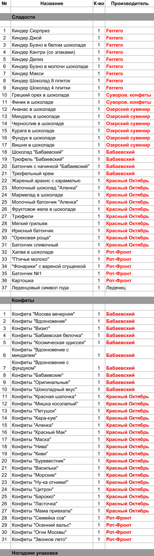 Жареный арахис с карамелью (1 шт), Молочный шоколад "Аленка" (1 шт), Мармелад в шоколаде (1 шт), Молочный батончик "Аленка" (1 шт), Фруктовое желе в шоколаде (1 шт), Трюфели (1 шт), Мягкий грильяж (1 шт), Ирисный батончик (1 шт), "Ореховая роща" (1 шт), Батончик сливочный (1 шт), Конфеты "Красная шапочка" (1 шт), Конфеты "Мишка косолапый" (1 шт), Конфеты "Петушок" (1 шт), Конфеты "Кара-кум" (1 шт), Конфеты "Аленка" (1 шт), Конфеты "Красный Мак" (1 шт), Конфеты "Маска" (1 шт), Конфеты "Нива" (1 шт), Конфеты "Киви" (1 шт), Конфеты "Буревестник" (1 шт), Конфеты "Васильки" (1 шт), Конфеты "Морские" (1 шт), Конфеты "Ну-ка отними!" (1 шт), Конфеты "Цитрон" (1 шт), Конфеты "Барокко" (1 шт), Конфеты "Ласточка" (1 шт), Конфеты "Мама приехала" (1 шт)