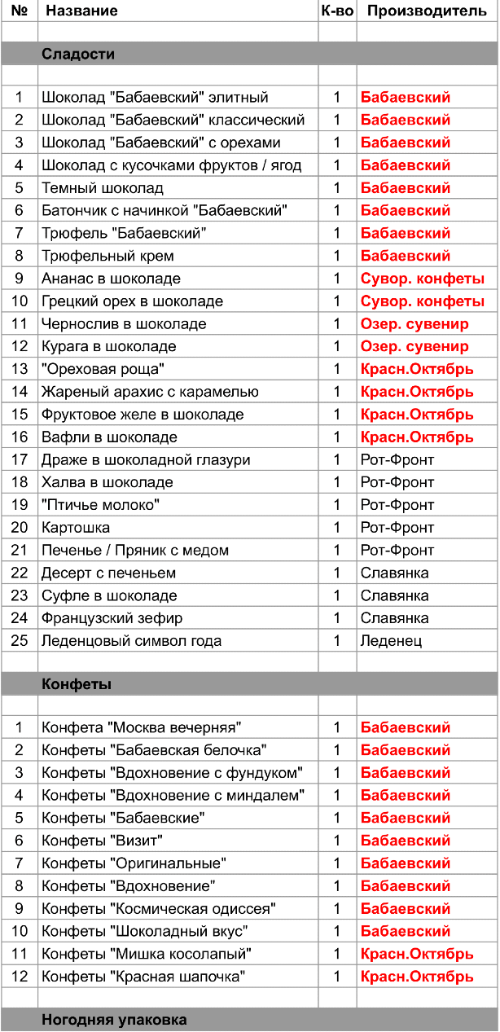 Шоколад "Бабаевский" элитный (1 шт), Шоколад "Бабаевский" классический (1 шт), Шоколад "Бабаевский" с орехами (1 шт), Шоколад с кусочками фруктов / ягод (1 шт), Темный шоколад (1 шт), Батончик с начинкой "Бабаевский" (1 шт), Трюфель "Бабаевский" (1 шт), Трюфельный крем (1 шт), Конфета "Москва вечерняя" (1 шт), Конфеты "Бабаевская белочка" (1 шт), Конфеты "Вдохновение с фундуком" (1 шт), Конфеты "Вдохновение с миндалем" (1 шт), Конфеты "Бабаевские" (1 шт), Конфеты "Визит" (1 шт), Конфеты "Оригинальные" (1 шт), Конфеты "Вдохновение" (1 шт), Конфеты "Космическая одиссея" (1 шт), Конфеты "Шоколадный вкус" (1 шт)